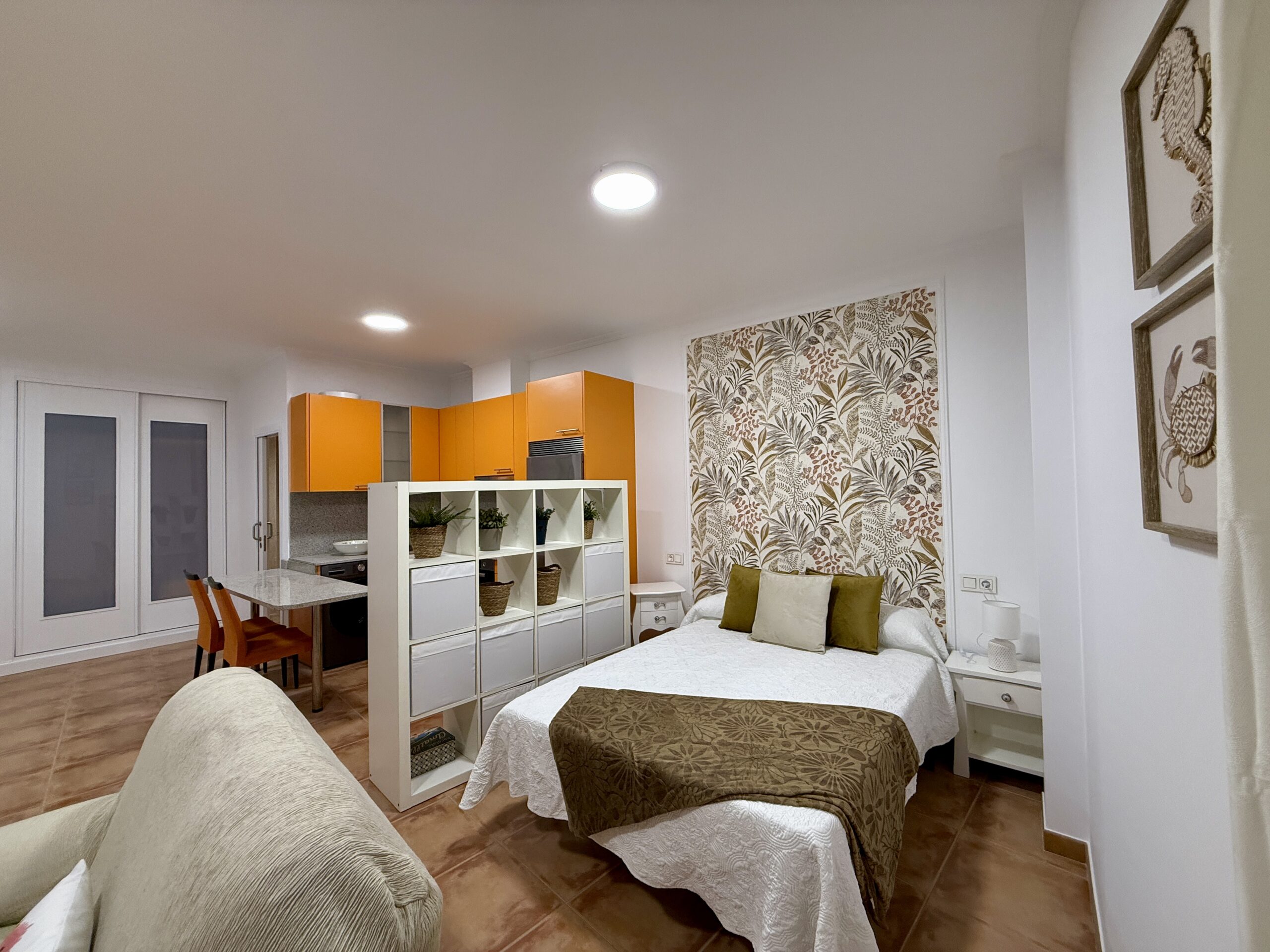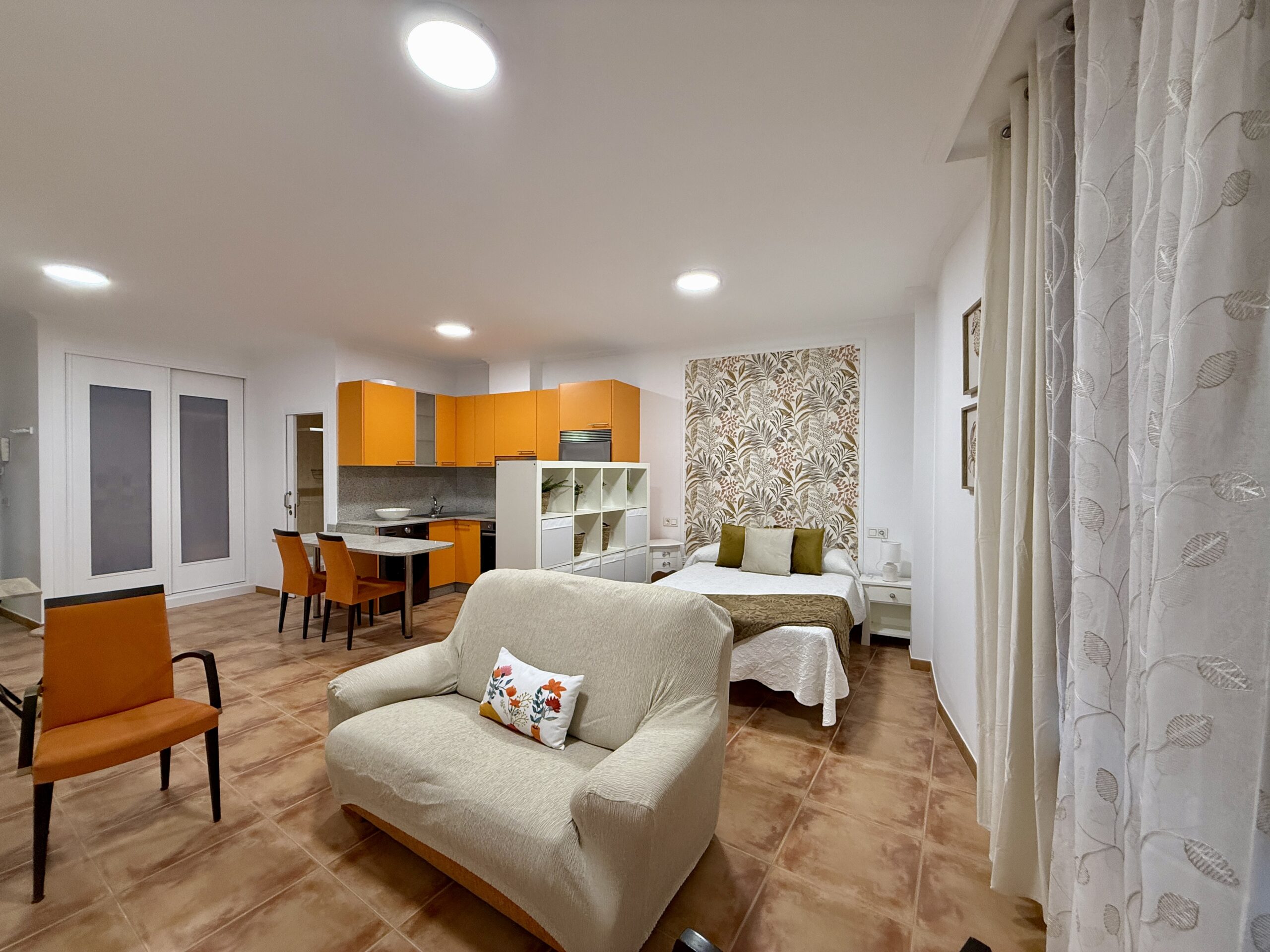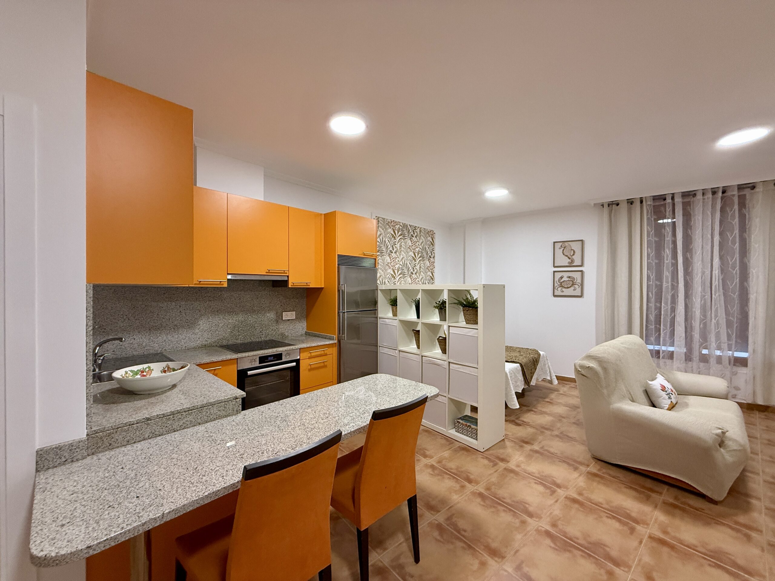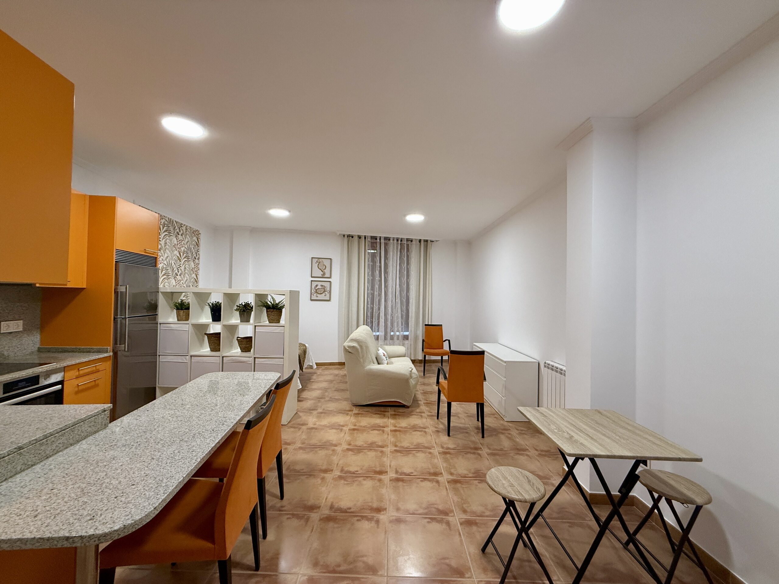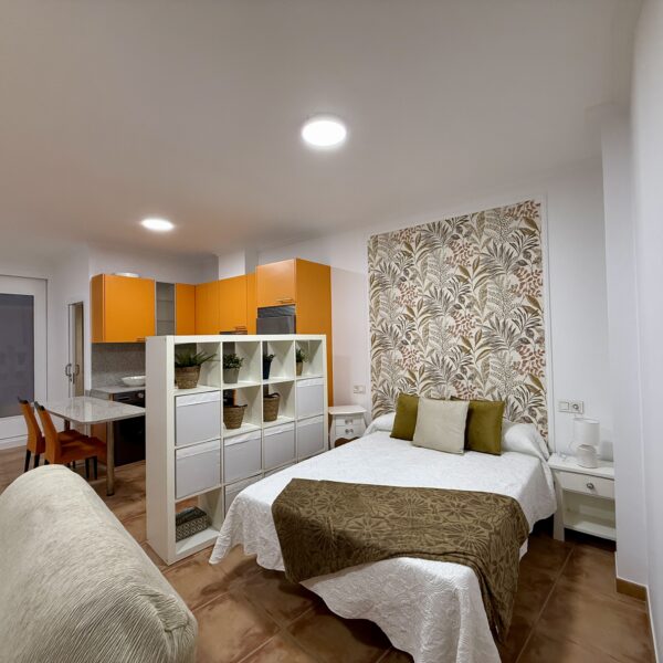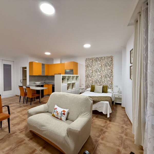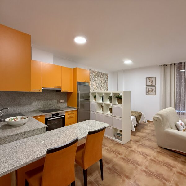Cocina totalmente amueblada y equipada con electrodomésticos, salita de estar, cama de 135cm y baño completo con plato de ducha