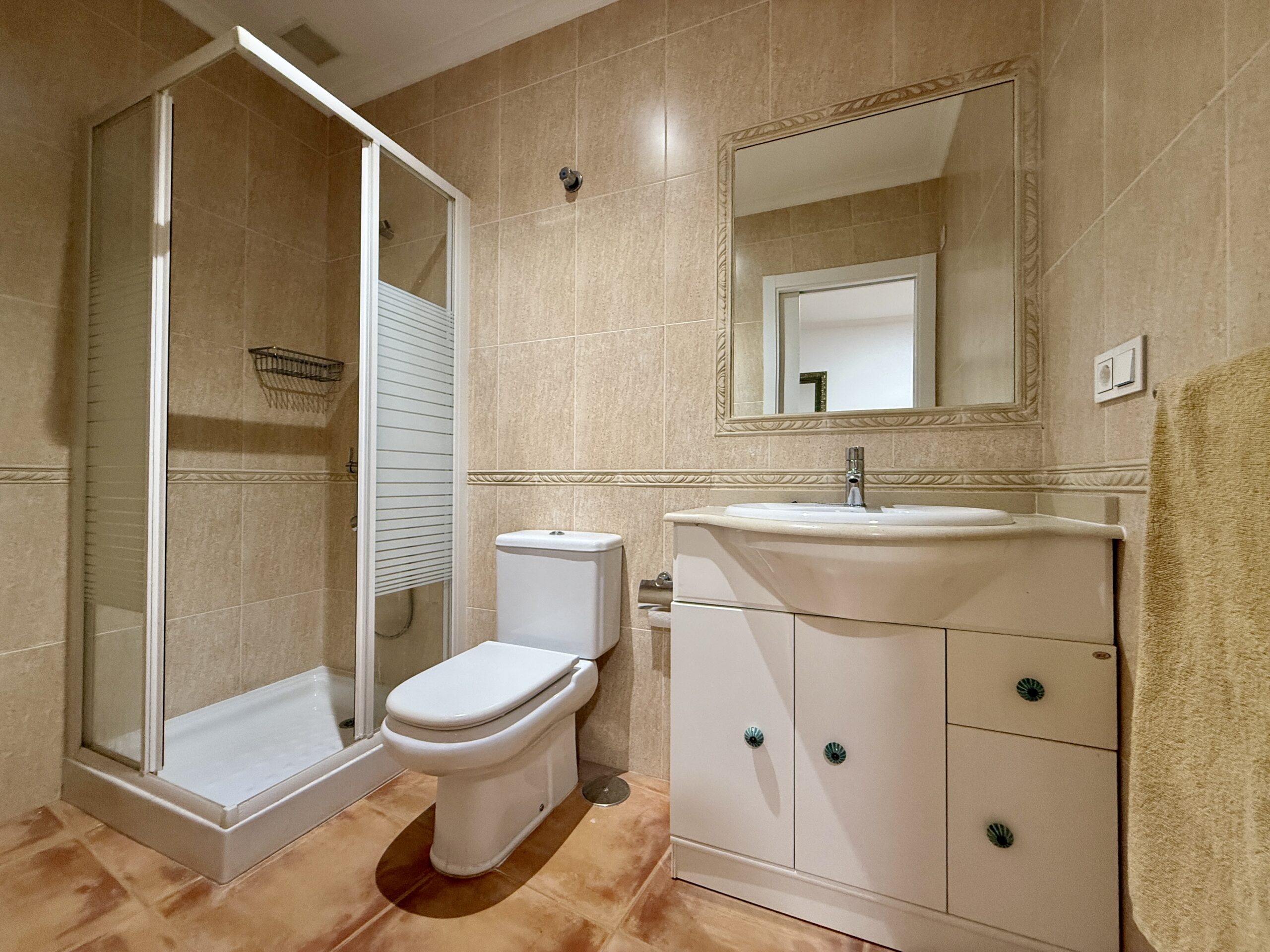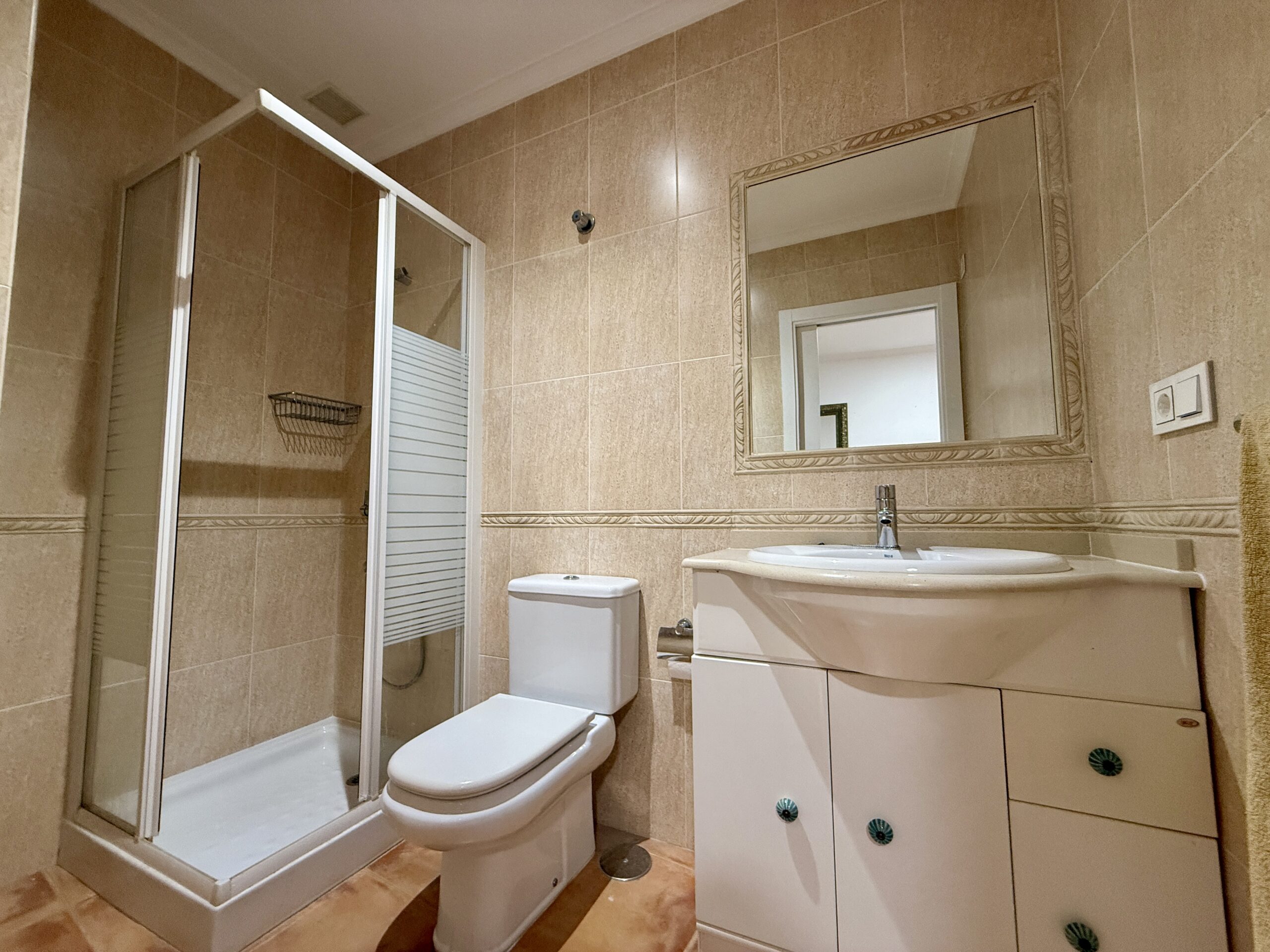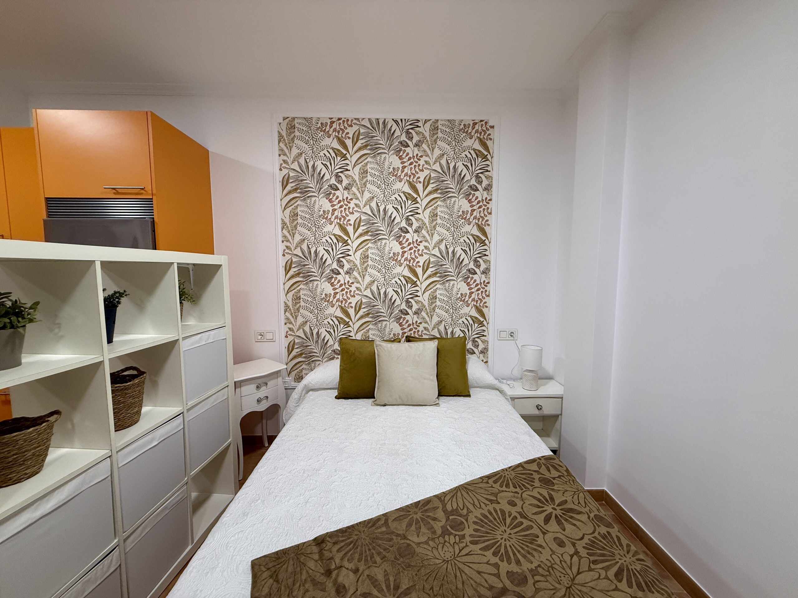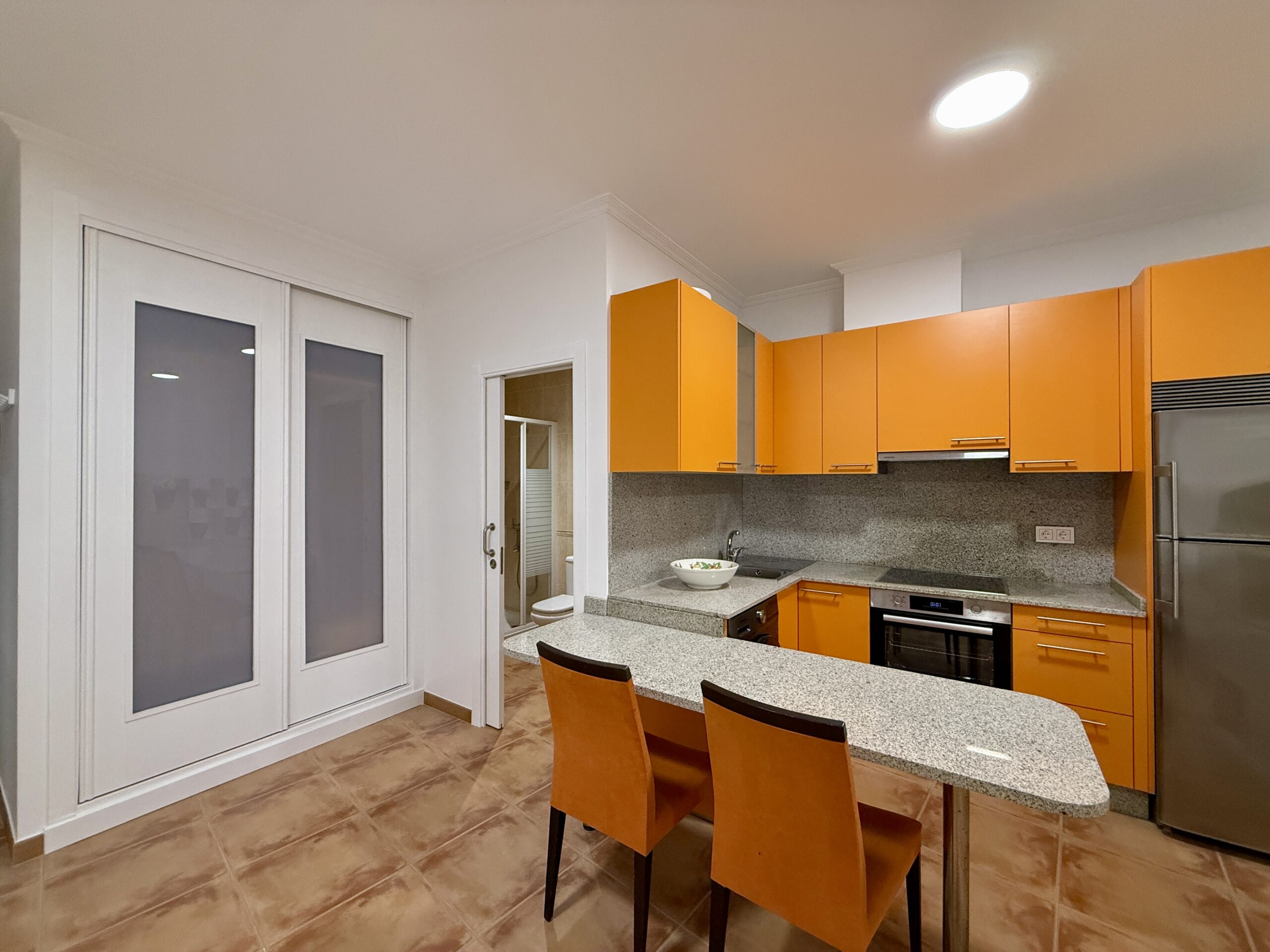 Cocina totalmente amueblada y equipada con electrodomésticos, salita de estar, cama de 135cm y baño completo con plato de ducha
