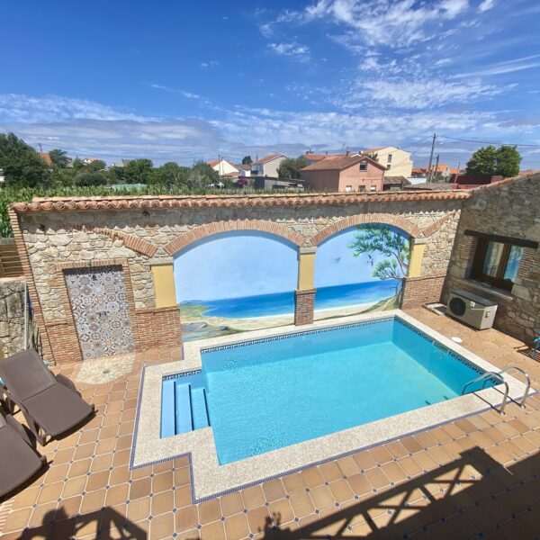 Zona exterior ajardinada con piscina, barbacoa y comedor de verano