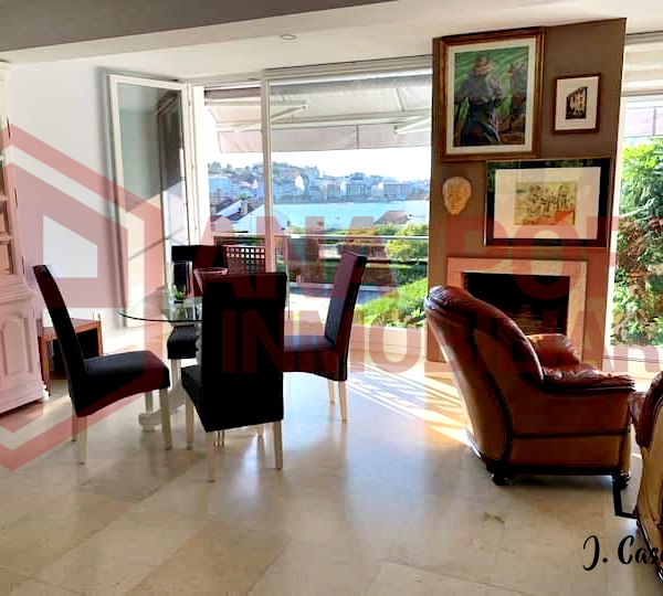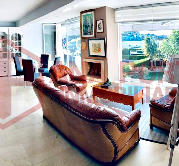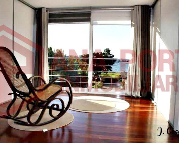 Estupendo salón con chimenea, con un gran porche orientado al mar