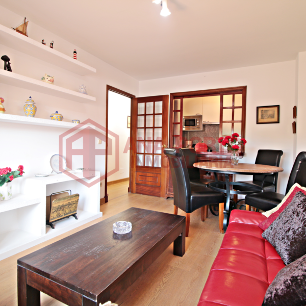 Salón con salida a una pequeña terraza y cocina totalmente equipada con pasaplatos a la zona de comedor
